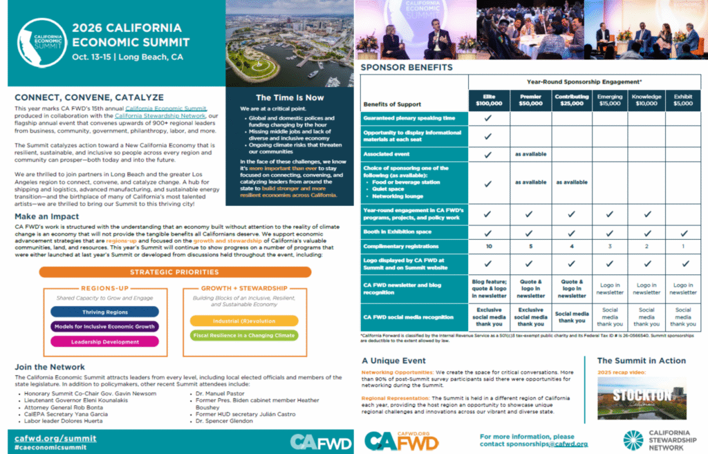 Check out our sponsorship flier to learn how your organization can contribute throughout the year to CA FWD’s work on this vital effort.
